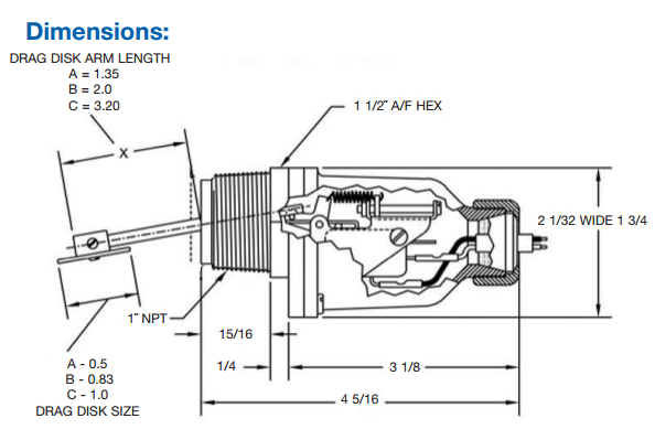 FSA-可連續(xù)調(diào)節(jié)流量開關 100-管徑 A-臂長 B-圓盤直徑 C-常開/常閉